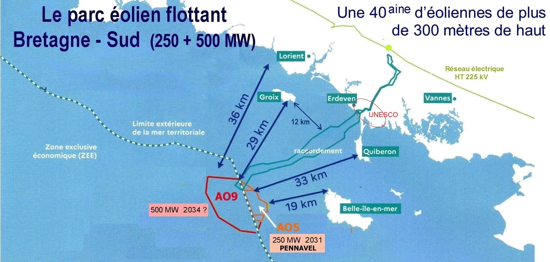 Rappelons que l'AO9 est le projet éolien flottant extension de l'AO5 ; il aurait une puissance de 500 MW, augmentant le nombre des éoliennes géantes de 13 (AO5) à une quarantaine au moins...