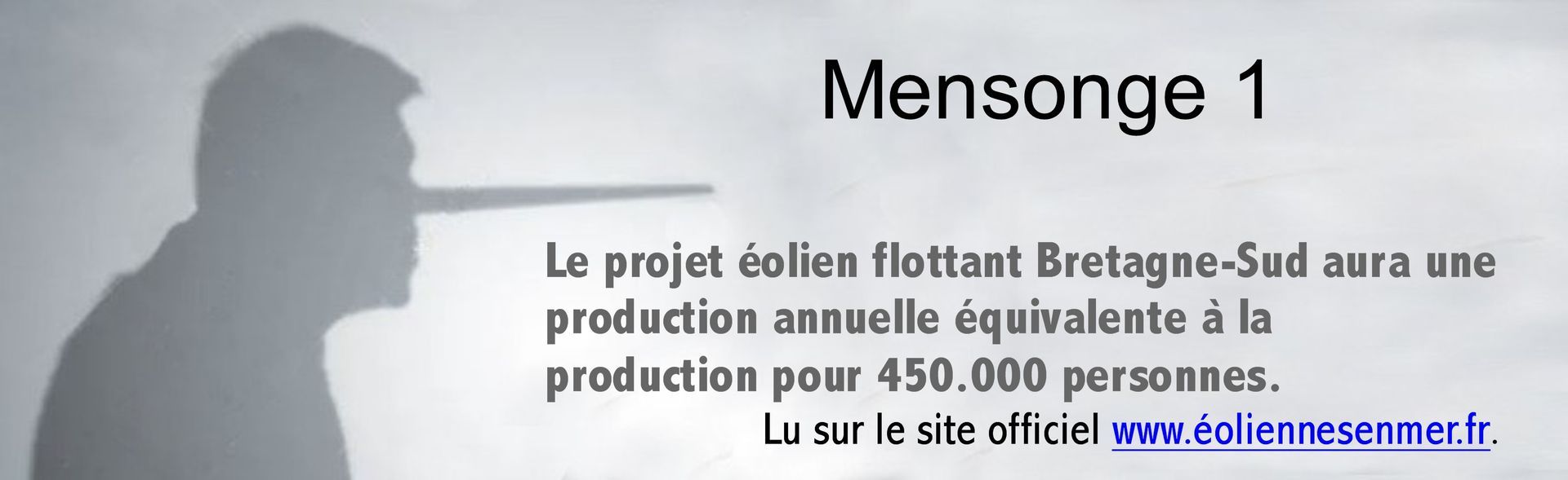 Ces annonces mensongères suggèrent en permanence, parfois de façon très explicite, que les éoliennes alimentent la population locale : sur le même site gouvernemental, on lit que l’usine éolienne de Saint-Brieuc aurait une production équivalente à 9% de la consommation de Bretagne, soit 835.000 personnes, que celle de Saint-Nazaire permettrait de satisfaire 20% de la consommation électrique de Loire Atlantique, soit 700.000 personnes… (le menteur s’emmêle alors dans ses calculs car la Loire atlantique compte 1,5 million d’habitants ; 700.000 en représentent donc 47 % et non 20%).